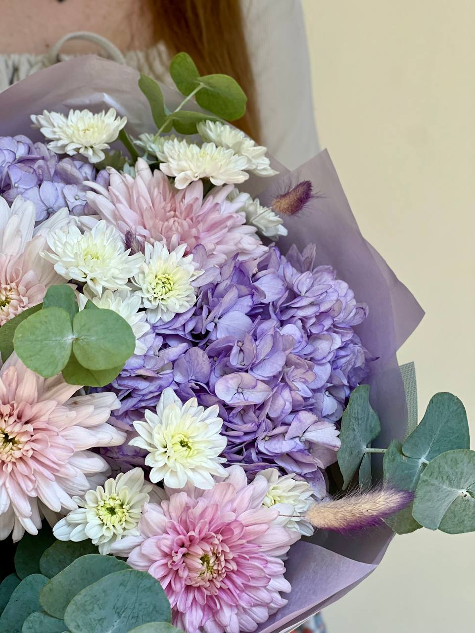 Нежный букет из Хризантем, 3-х Гортензий и Эвкалипта. Этот букет станет отличным подарком на праздник, день рождения или просто для выражения своих чувств.